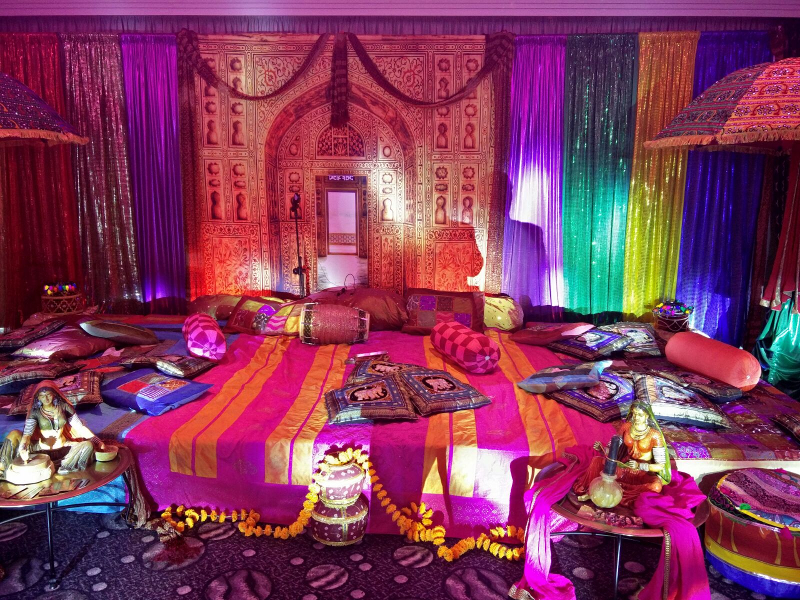 Authentic and Festive Decor: Our decorations are meticulously crafted to capture the essence of a traditional Ladies Sangeet night. From vibrant drapes and intricate backdrops to traditional umbrellas and plush cushions, our decor options create an authentic and lively atmosphere for your event.